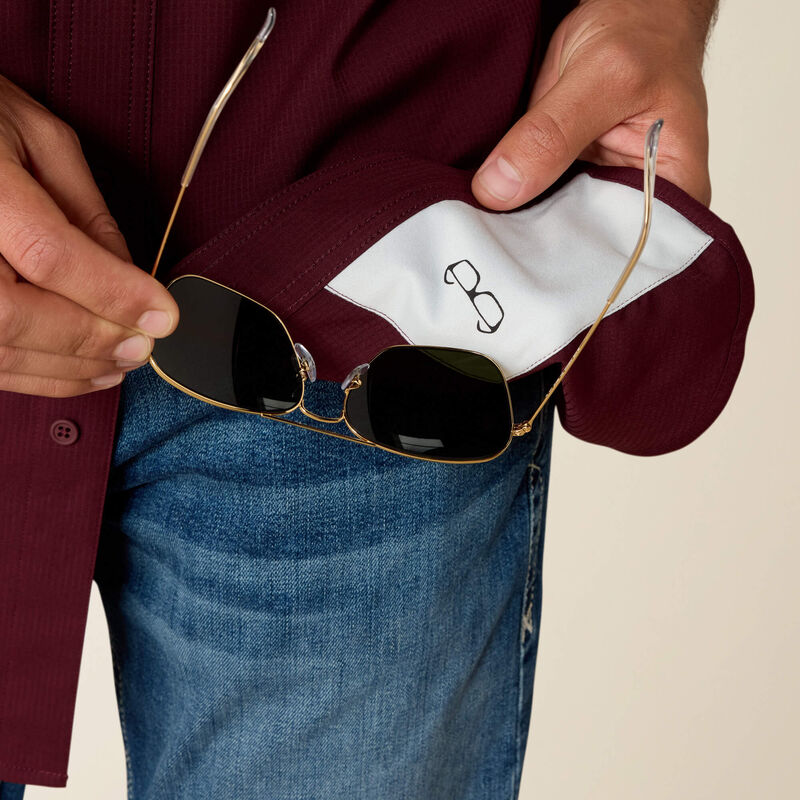 - Hidden microfiber lens cloth on shirt tail
