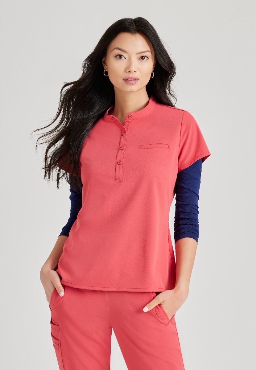 Clean and effortless, Barco Unify women's tops are crafted from our premium Luxe360 fabric. Our stretch twill has enough body for all the beautifully tailored details, but with a soft, supple drape and 4-way stretch that moves with you. This henley style top is made for women that want to step outside their comfort zone.
