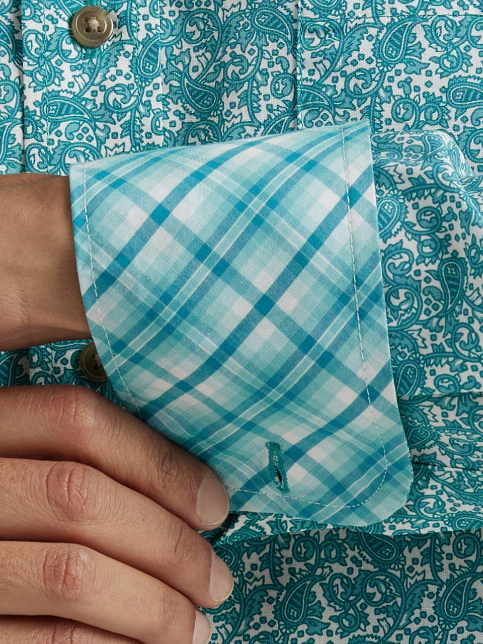 Men's Wrangler George Strait turquoise paisely print long sleeve shirt with contrasting trim.